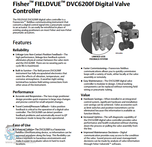 DVC6200f 已由 Fieldbus Foundation 注冊,使用獲得專利的少連接、無接觸行程反饋技術。它提供全數字 Foundation 現場總線開放式通信協議。安裝到愛默生過程管理 PlantWeb™ 系統(tǒng)中后,該儀表將會不斷運行在板閥診斷。如果檢測到問題,將自動把信息轉發(fā)給相應的人員。