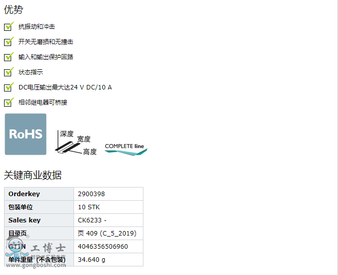菲尼克斯PLC-INTERFACE帶有確認觸點,包括底座端子,采用插拔式連接并集成有微型固態繼電器,用于安裝在DIN導軌NS 35/7.5上,1個常開觸點,輸入:24 V DC,輸出:3 - 33 V DC/10 A