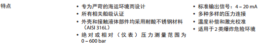 MBS 33M 壓力變送器通過了船級認證,它幾乎可以用于所有的海上應用。即使在惡劣的環境條件下,它也能提供可靠的壓力測量。這款靈活的壓力變送器系列通過了 LR、DNV、GL、RINA、ABS、BV、NKK、PRS、MRS 認證,特點包括輸出信號為4-20 mA 、絕對壓力和表壓(相對壓力)類型、從 0-1 到 0-600 bar 的測量范圍、插頭和電纜連接以及規格齊全的壓力連接。良好的抗振能力,可靠的結構,以及高度的 EMC/EMI 保護,使得該壓力變送器符合*嚴格的海上應用要求。 4- 20 mA 輸出信號 工作溫度 -40 到 85°C 測量范圍 0 - 600 bar 規格齊全的壓力連接 通過了所有相關的海上應用認證,可以滿足*嚴格的海上設備要求