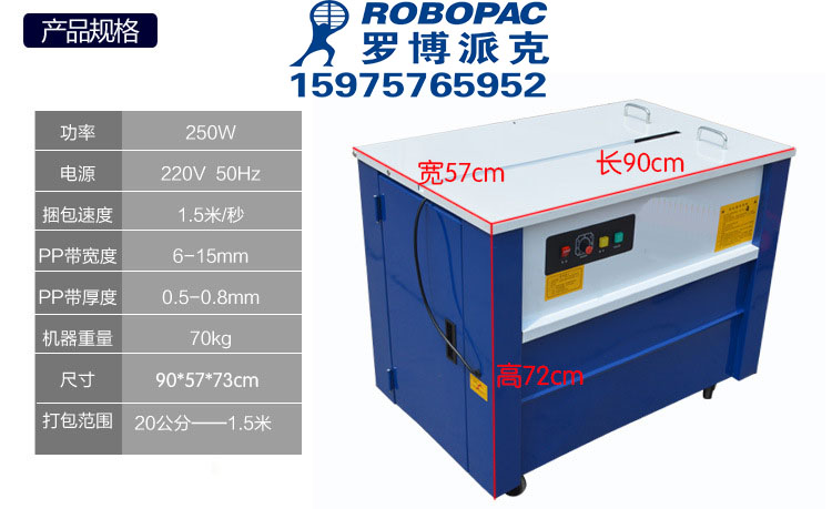 佛山市禪城羅博派克ROBOPAC自動化包裝設備廠的其他產品有:高臺自動打包機,全自動打包機,側打型打包機,郵政打包機,全自動無人化打包機,棧板打包機,全自動穿劍式打包機,全自動水平式打包機,手提式電熱打包機,優質手工打包機,免扣打包熔鉗,無人化打包線,自動包裝流水線,打包帶輪轉印字機,高強度PP打包帶,高強度PP打包扣 高低臺熱熔打包機 紙箱捆包機PP塑料帶捆扎機