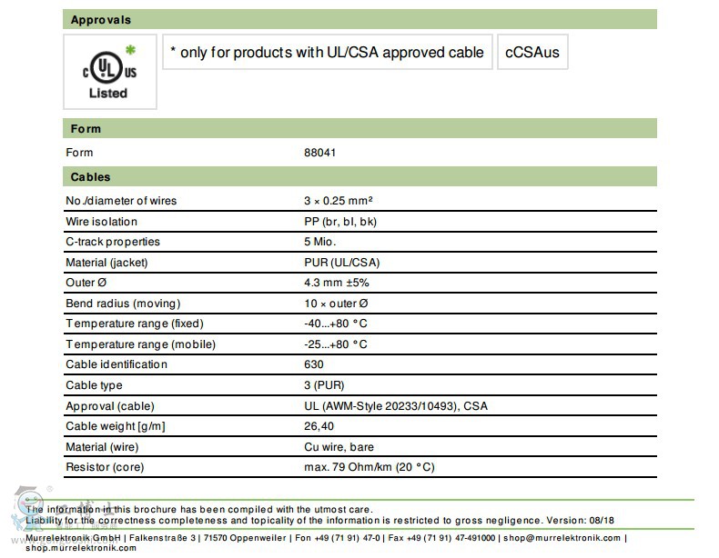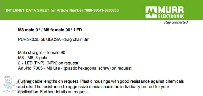 德國MURR穆爾一級代理.產品包括:連接器、變壓器、電源開關、電池閥、I/O模塊.傳感器與執行器的連接系統:M8系列連接器:M8插頭、M8單頭帶線、M8雙頭帶線.M12系列連接器:M12單頭帶線、M12插頭、M12雙頭帶線.分線盒系列:M8、MVPS8、M12、MVP12、特殊連接器、電磁閥插頭.自動化系統:IP120緊湊型模塊 MBK、IP120可擴展型模塊 MBM、IP67緊湊型模塊 MVK、ASI總線模塊、IP20/40MASi、IP67MASI、IP68MASI.接口模塊:光耦/固態繼電器、光耦模塊、電源光耦模塊、電機控制模塊、直流電機控制模塊、智能接口模塊、前置操作面板、線路濾波器、干擾抑制器、接觸器的抗干擾抑制器、電磁閥適配器、電機干擾抑制器、通用干擾抑制器、繼電器模塊、單路薄片式繼電器、多路薄片式繼電器、時間繼電器.變壓器和緊湊型電源:變壓器、緊湊型電源模塊、單相、濾波、線性濾波、開關電源、三相、電壓轉換及整流模塊、電壓轉換.等。