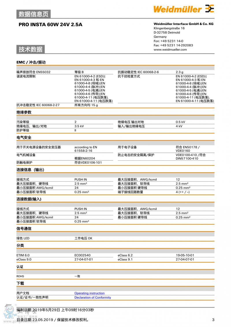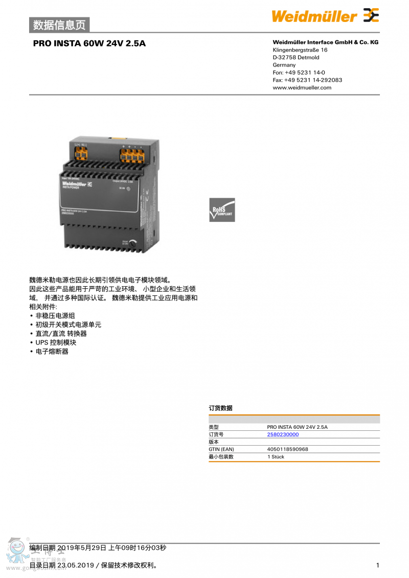 魏德米勒weidmulle電源PRO INSTA 60W 24V 2.5A訂貨號2580230000 |