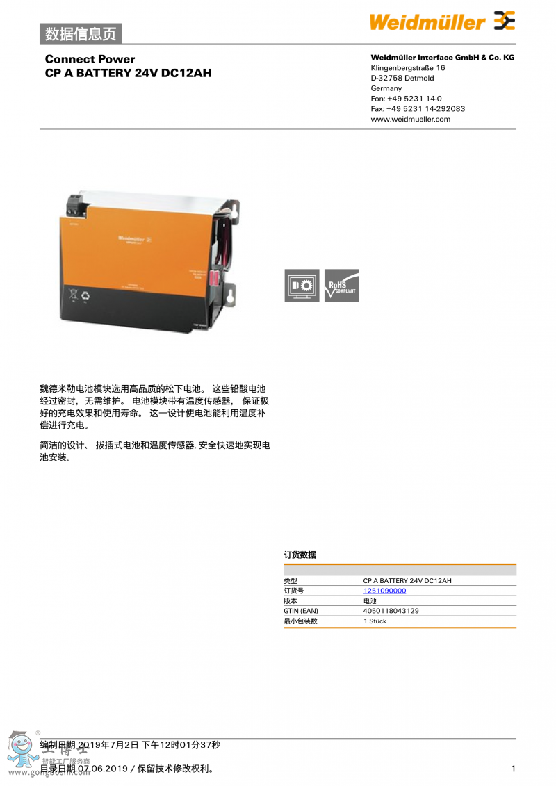 CP A BATTERY 24V DC12AH魏德米勒 UPS電池 訂貨號1251090000 |