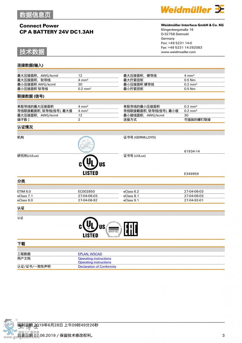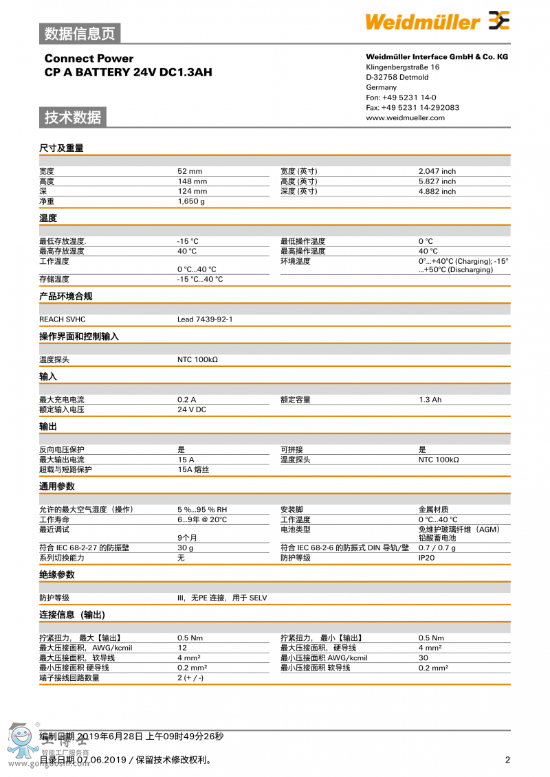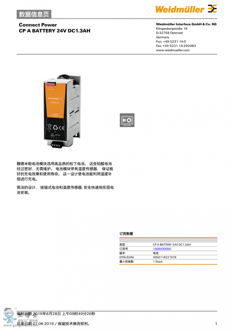 CP A BATTERY 24V DC1.3AH魏德米勒 UPS電池 訂貨號1406930000 |