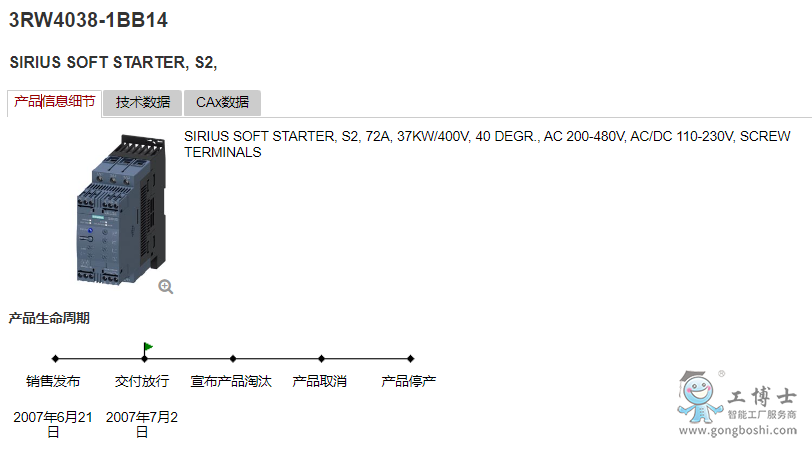 SIRIUS 軟起動器 S2 72 A,37 kW/400 V,40 °C 200-480 V AC,110-230 V AC/DC 螺釘端子 |