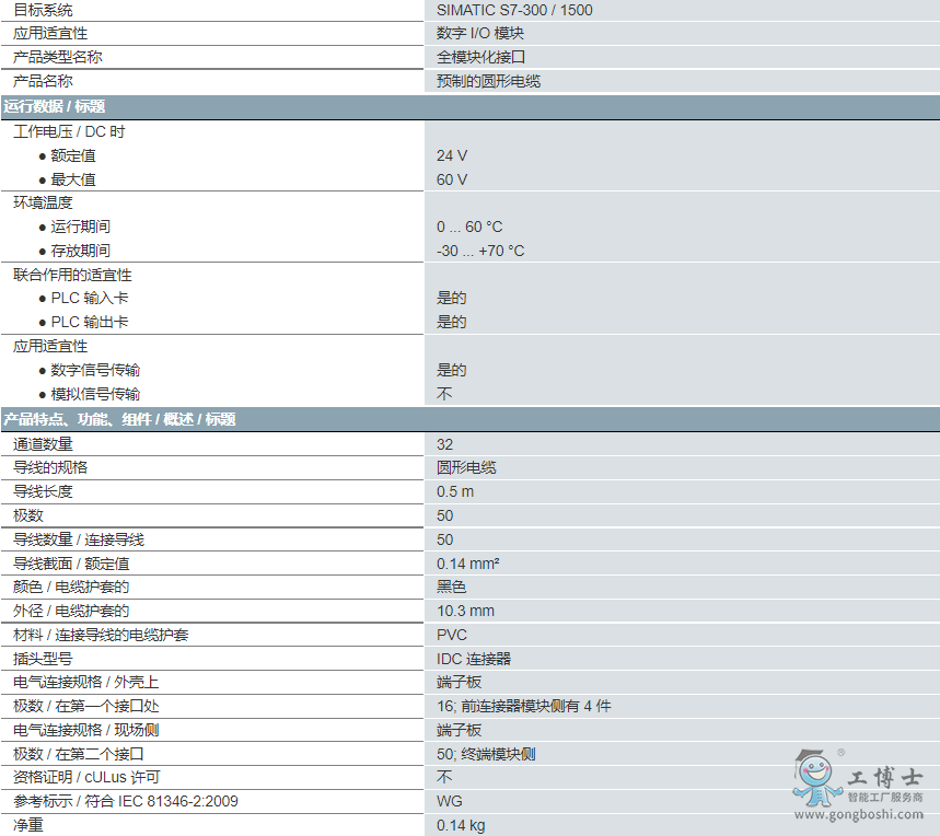 連接導(dǎo)線,未屏蔽 用于 SIMATIC S7-300/1500 0.14mm2 在前連接器模塊(4x16 極) 與連接模塊(1x50 極)之間 帶 IDC 連接器,L = 0.5 m。
