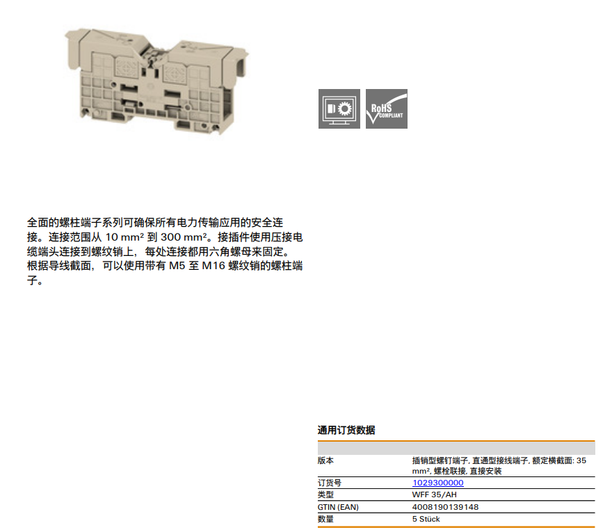Weidmuller WFF 35/AH 魏德米勒 插銷型螺釘端子 訂貨號1029300000 |