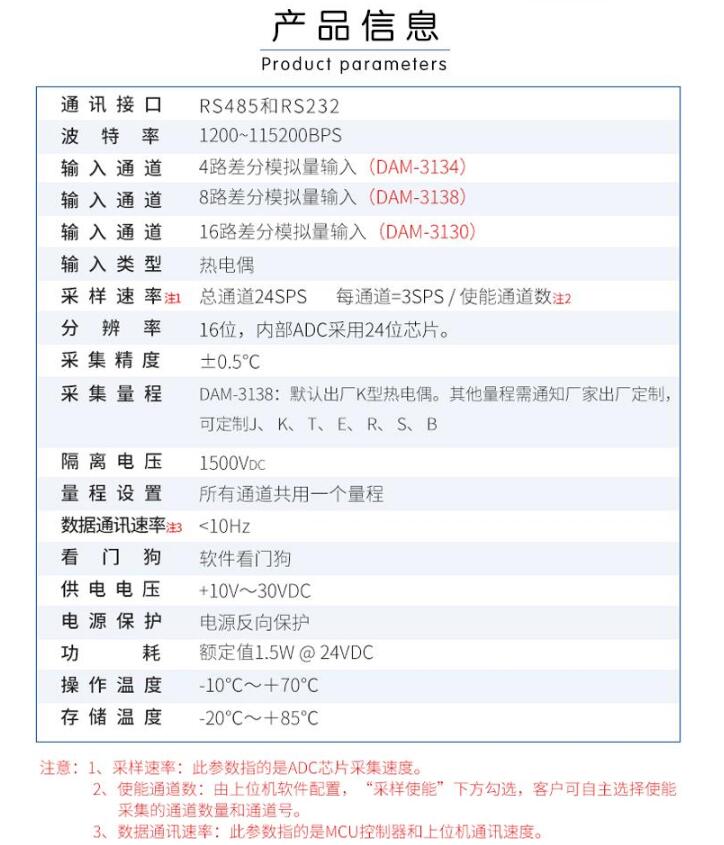 DAM-3134/8是4/8路熱電偶溫度采集模塊,16位分辨率內(nèi)部ADC采用24位芯片采樣精度±0.5℃,默認(rèn)出廠(chǎng)K型熱電偶、可定制J、K、T、E、R、S、B型。